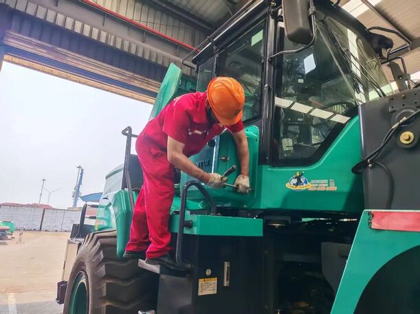作為此次客戶關(guān)愛行活動的重要一站,山推服務團隊頂著盛夏酷暑,率先奔赴山東區(qū)域某港口,為客戶的6臺LE60-X5電裝整機提供全方位檢修服務。抵達現(xiàn)場后,服務人員迅速投入工作。針對港口作業(yè)環(huán)境的特點,團隊制定了精細化服務方案:首先對6臺整機開展全車點檢,重點檢查核心組件的運行狀態(tài),細致排查螺栓緊固度,確保設(shè)備關(guān)鍵部位無隱患。