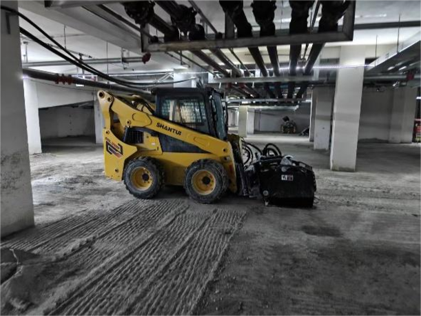 近日,在天津市河西區(qū)某高端住宅小區(qū)的地下車庫施工現(xiàn)場,一臺山推SSL75V-M滑移裝載機(jī)正有條不紊地進(jìn)行地面銑刨拉毛作業(yè)。作為該項(xiàng)目地下車庫施工中的核心設(shè)備之一,SSL75V-M憑借其靈活機(jī)動(dòng)的作業(yè)能力、卓越的多功能屬具配置和高效穩(wěn)定的施工表現(xiàn),為客戶解決了效率低、空間受限等施工痛點(diǎn)。