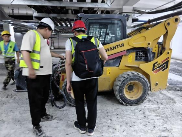 項(xiàng)目啟動(dòng)后,山推技術(shù)團(tuán)隊(duì)為客戶量身推薦了SSL75V-M滑移裝載機(jī),配置快換銑刨鼓及清掃器等屬具。面對地庫內(nèi)2.1米的高度限制,SSL75V-M整機(jī)高度僅2065mm,轉(zhuǎn)向靈活,在狹小空間內(nèi)表現(xiàn)出色;配套的大流量屬具液壓系統(tǒng),保障了銑刨鼓的動(dòng)力輸出,在硬質(zhì)水泥地面也能高效作業(yè),日均銑刨面積可達(dá)1000㎡,施工效率提升75%以上。