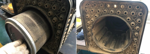 3、清理空氣濾清器一側(cè)的排灰閥,排除里面的灰塵。用氣槍清理濾芯時,要沿濾芯內(nèi)側(cè)向外側(cè)清理,切不可由外向內(nèi)吹(氣槍壓力在0.2MPa),請注意:濾芯在清理六次后應(yīng)進(jìn)行更換。