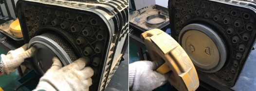 6、確保濾芯安裝牢靠后,用雙手旋入濾芯密封蓋,如有出現(xiàn)濾芯密封蓋無法完全旋入的情況,應(yīng)檢查濾芯是否有卡滯、安裝不到位的情況,濾芯密封蓋安裝無誤后,安裝側(cè)蓋板,依次緊固空氣濾清器周圍的卡箍,檢查空氣濾清器密封性,確保各部件沒有泄漏。