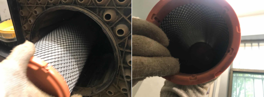 2、用雙手旋轉(zhuǎn)濾芯密封蓋直至旋下密封蓋,在殼體中輕輕的取出舊濾芯。