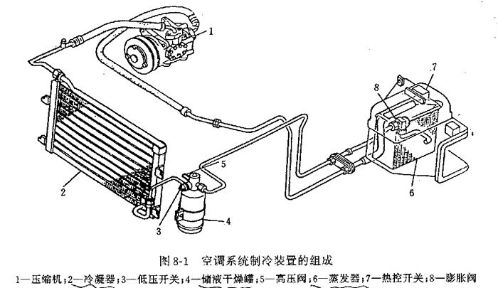 1-電磁離合器及壓縮機(jī)2-冷凝器3-低壓開關(guān)4-儲(chǔ)液干燥器5-高壓閥6-蒸發(fā)器7-熱控開關(guān)8-膨脹閥